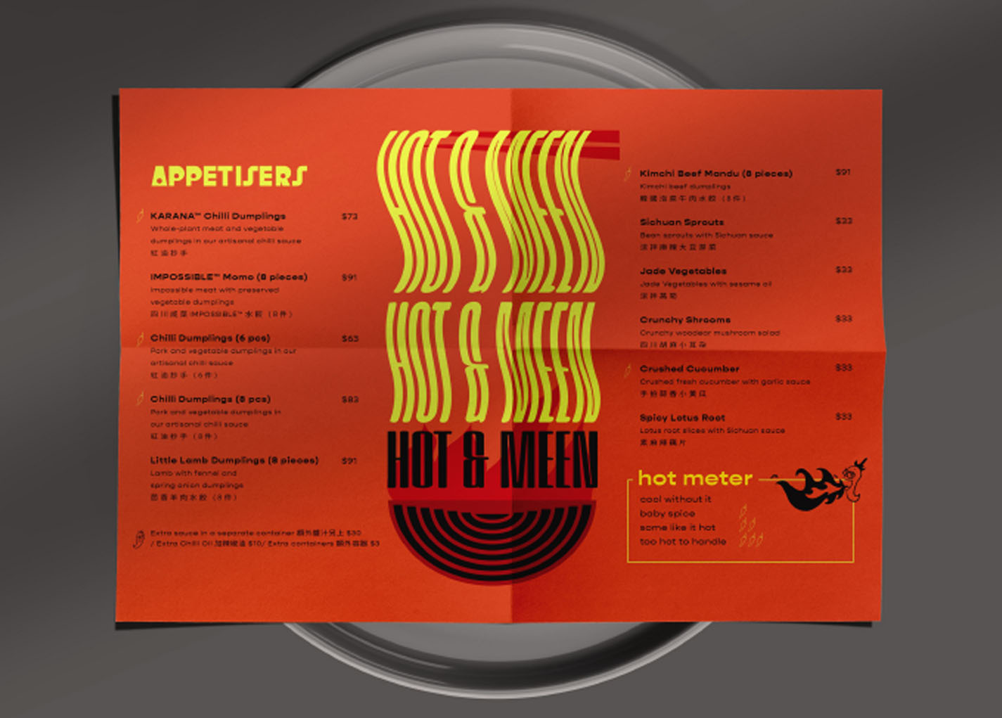 From the masterminds behind Chilli Fagara, Hong Kong’s Sichuan mainstay, HOT ‘N’ MEEN is a delivery-only noodle concept worth drooling over. The tongue-in-cheek name pays homage to Chilli Fagara’s spicy legacy, and makes its offering clear with the use of ‘meen’, the Chinese word for noodles. Take a slurp of spicy noodles packed in smoky hot typography – a branding design created around steaming wriggly noodles and fiery flames to promise you nothing less than a punchy meal.